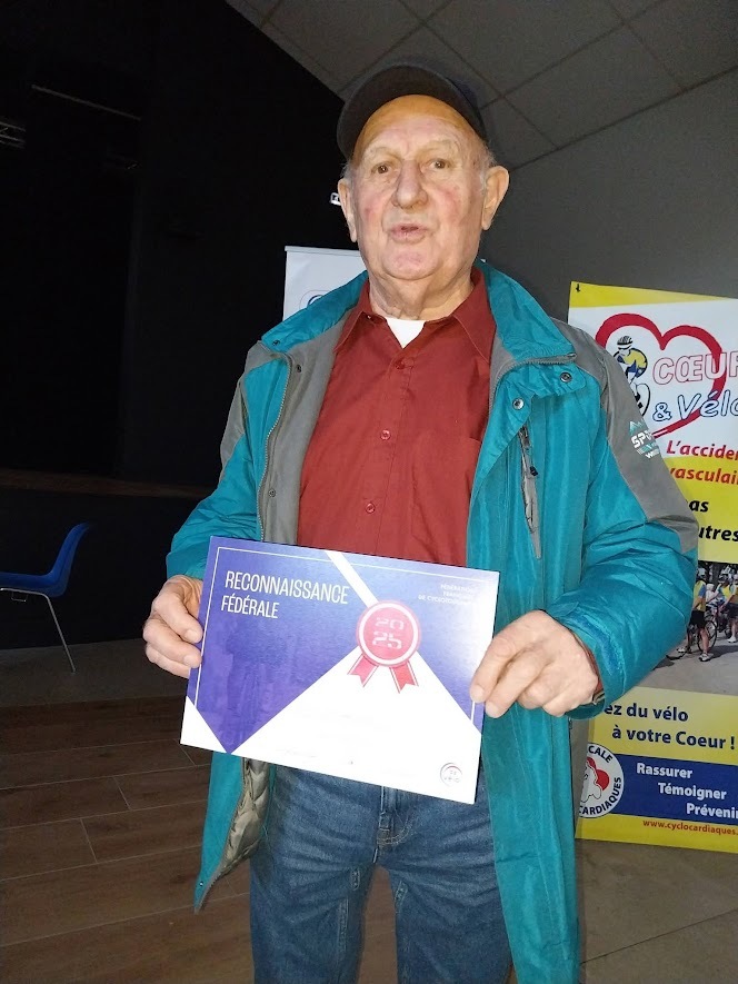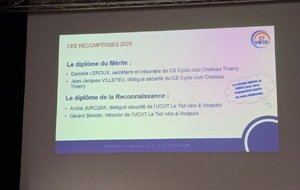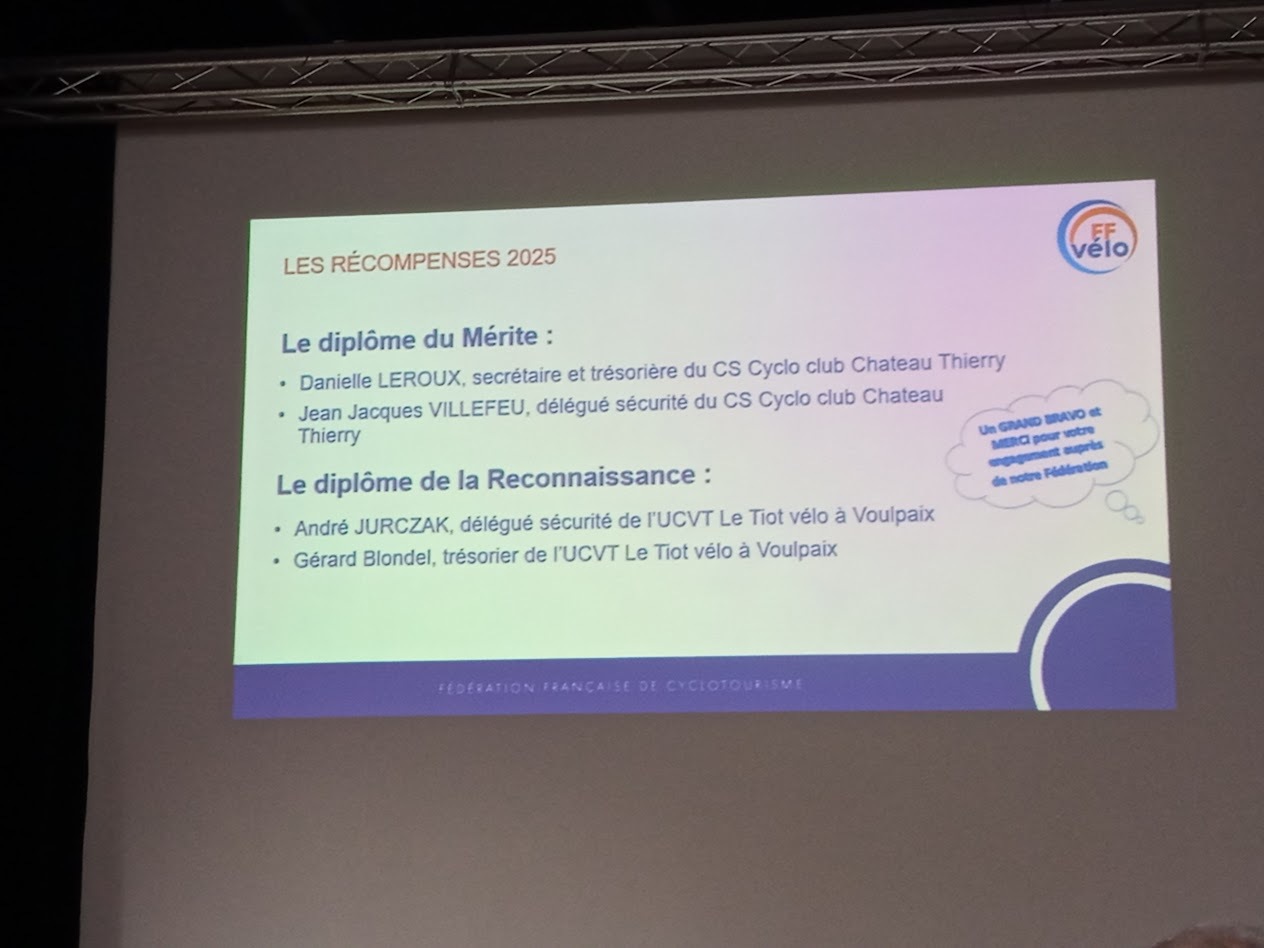Récompenses 2025 : Diplôme du Mérite : Danielle Leroux - secrétaire et trésorière du CS cyclo Chateau-Thierry ; Jean-Jacques Villefeu - délégué sécurité du CS cyclo Chateau-Thierry ; Diplôme de la Reconnaissance : André Jurczak - délégué sécurité UCVT Le tiot Vélo de Voulpaix ; Gérard Blondel - trésorier UCVT Le Tiot Vélo de Voulpaix.